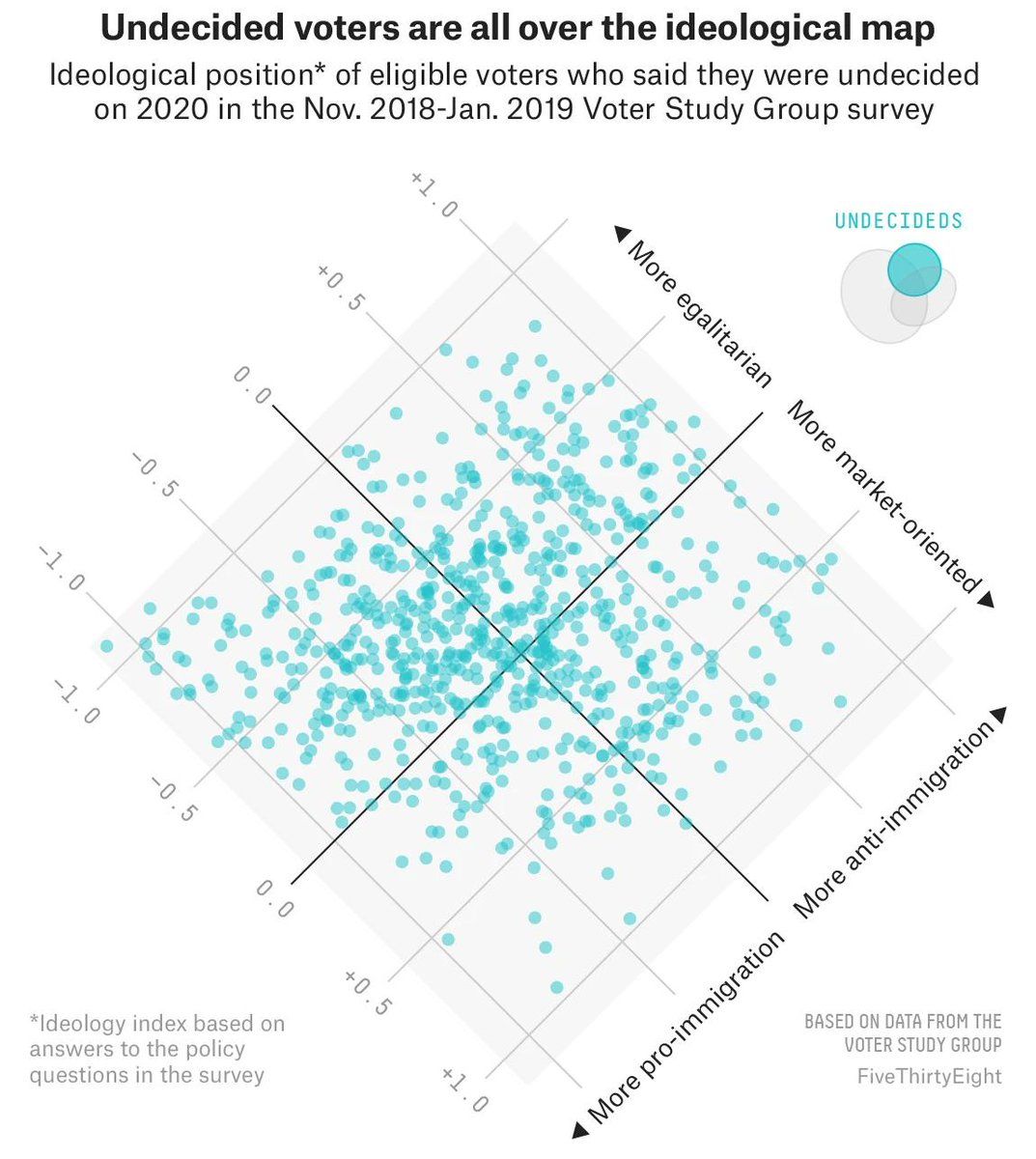 Dems don’t need to be more moderate to win in 2020. FiveThirtyEight shows that on policy, independents, moderates, and undecided voters are all more “egalitarian” and pro-immigrant (lower left quadrant) fivethirtyeight.com/features/the-moderate-middle-is-a-myth/