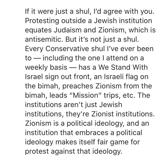 PopChassid I struggle with “resist Jewish power”. A generous interpretation could be "resist our people having power over others”, which is what Zionism is. Maybe too generous, though. Protesting at a shul makes sense to me, because it’s not just a shul. As I said on r/judaism: