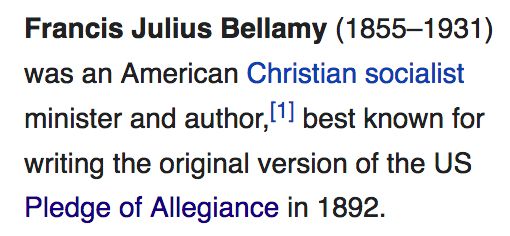 Bellamy was a minister who believed in separation of church and state. That he was a socialist makes it extra ironic that Congress added “under god” in the 1950s to stick it to those godless commies