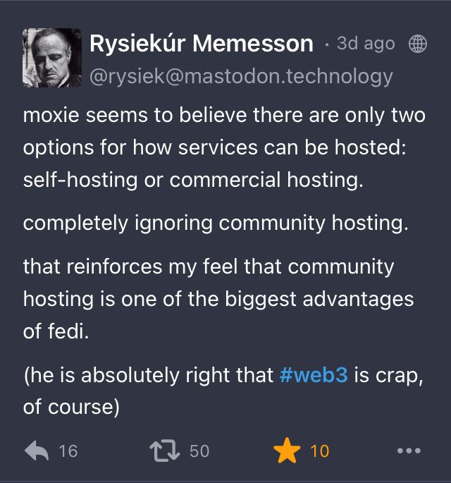 Been thinking about this post I saw on Mastodon about community hosting. On one hand, yes, absolutely! It reminds me of when the public library was my ISP and I’d dial in from my 14.4 modem. 1/2