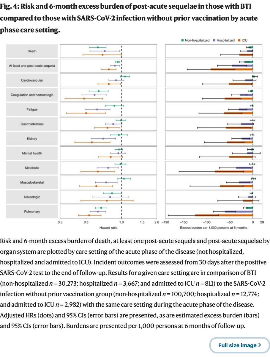 tweetjoshtweet Figure 4, though, shows that being vaccinated vs not is more protective of long covid for _more_ severe cases, but that for clinically mild cases, risk of long covid is statistically indistinguishable from unvaccinated people (except for coagulation/hematologic and pulmonary).