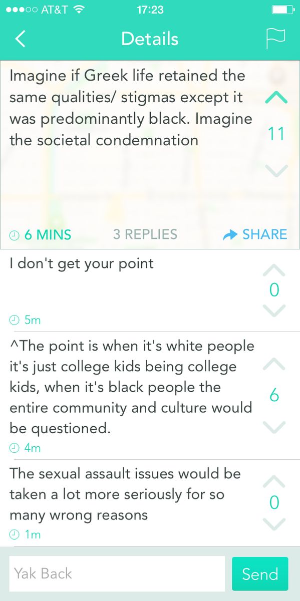 Seriously some of the smartest Yik-Yakking I’ve seen. I didn’t know they had it in them. #race #greek #rapeculture