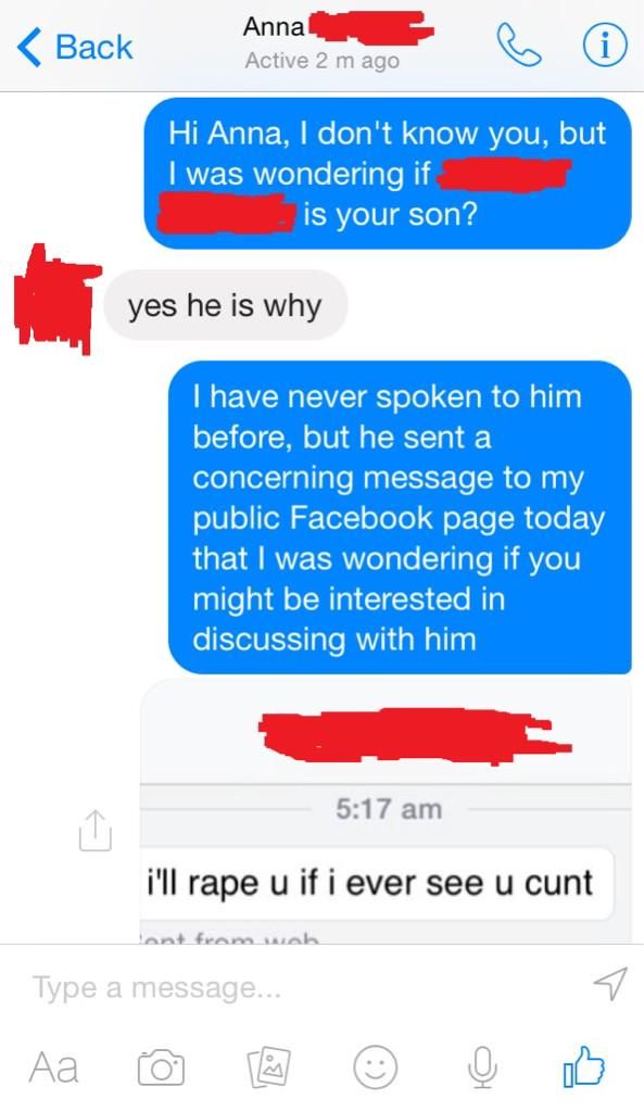 : Sometimes young boys on Facebook send me rape threats, so I've started telling their mothers.