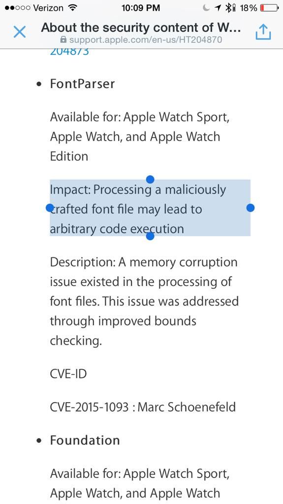 : Arbitrary code execution via fonts on your watch. A thing in 2015. #whatatimetobealive