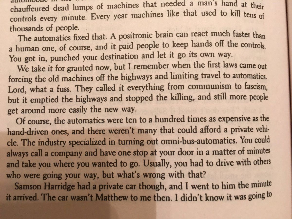 1953: Asimov nails Uber’s self-driving business model. Also pegs the introduction of self-driving cars at 2015