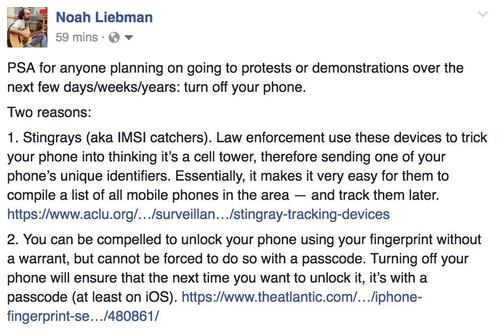 If you’re planning on marching over the next few days/weeks/years, turn off your phone. IMSI catchers + fingerprints