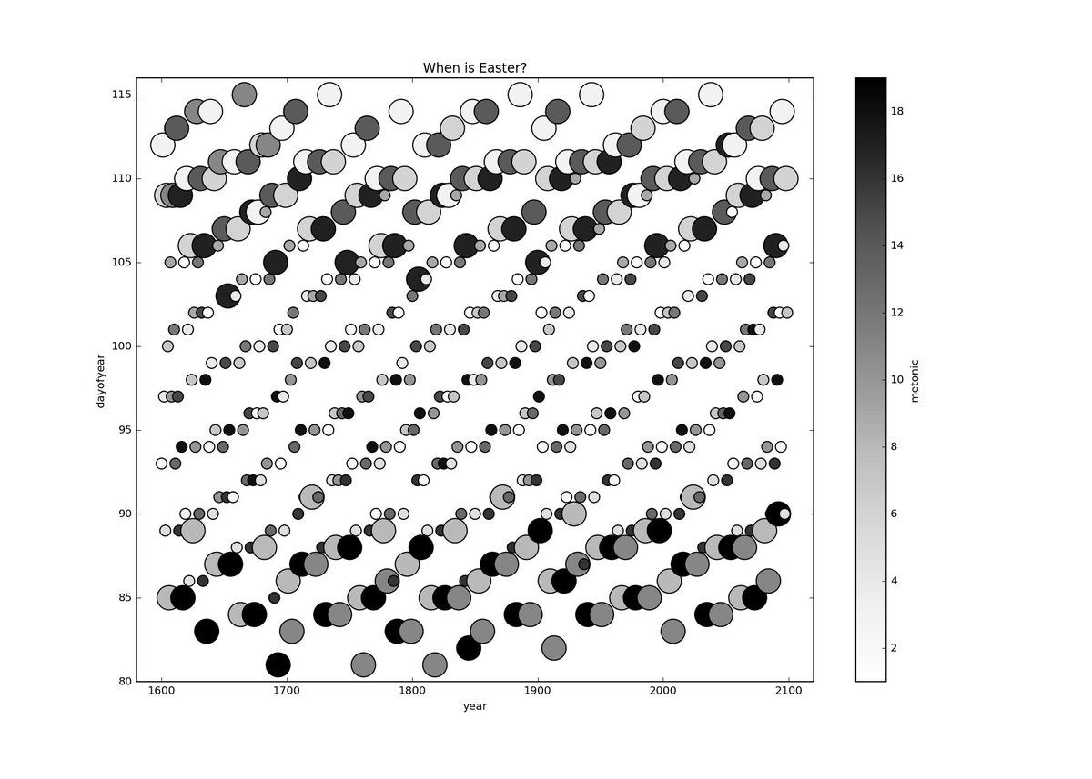 Looks like late easter corresponds with earlier in the metonic cycle; earlier easter with later in the cycle. /cc iamreddave qntm