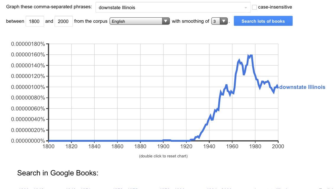 loganjaffe Seems like it took another 30–40 years. books.google.com/ngrams/graph?content=downstate+Illinois&year_start=1800&year_end=2000&corpus=15&smoothing=3&share=&direct_url=t1%3B%2Cdownstate%20Illinois%3B%2Cc0#t1%3B%2Cdownstate%20Illinois%3B%2Cc1 Of course, newspaper data might tell a different story than books