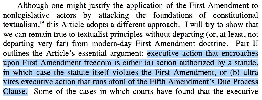 There’s disagreement from strict textualists, but this article argues that executive action that violates the 1st Amendment is either authorized by statute (my guess), or violates the 5th Amendment’s Due Process clause. ameliatd/954414959227756544